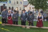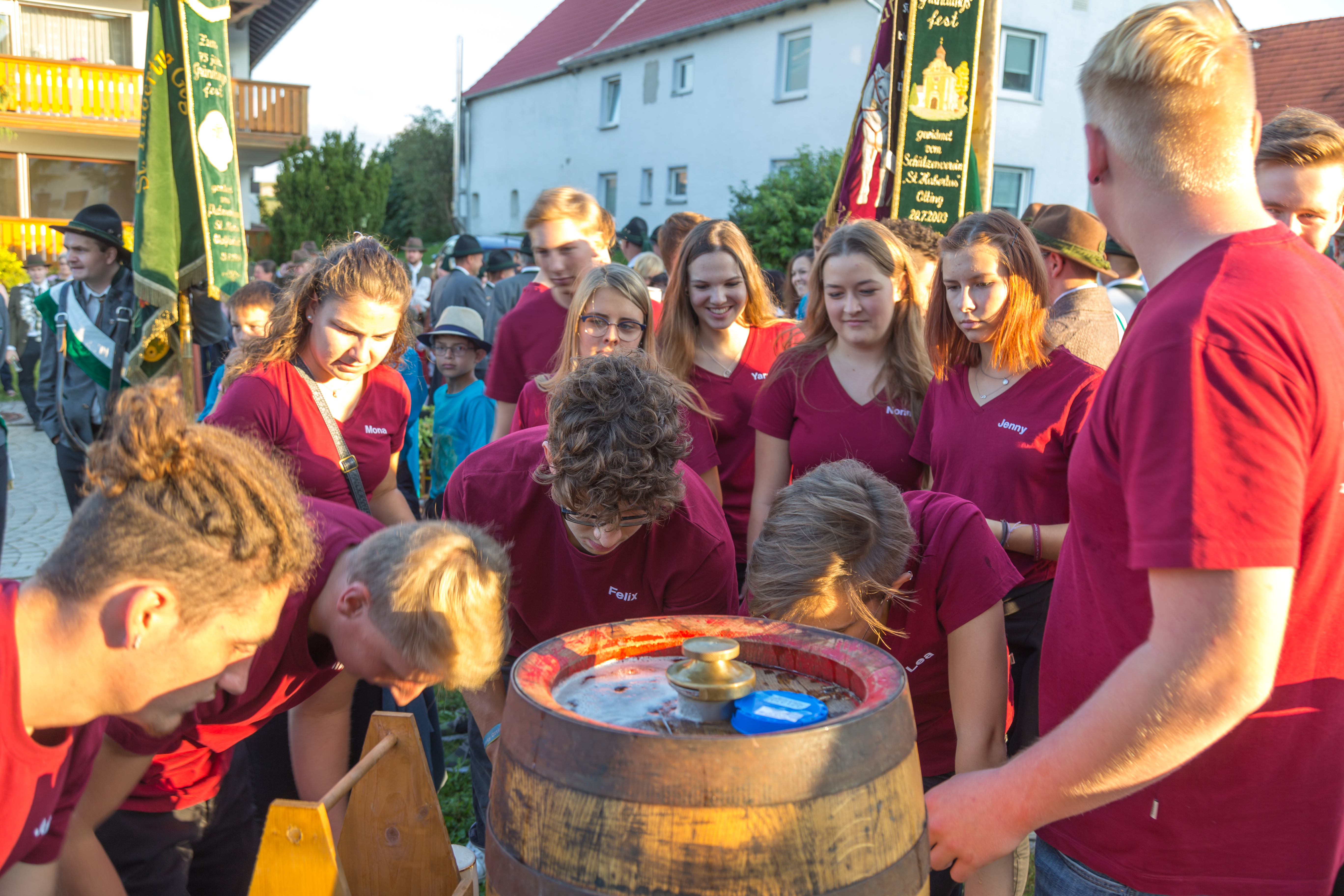 Nach einem großen Empfang mit der Musikkapelle Wolferstadt machten es Wolferstädter den Ottingern aber nicht leicht. Vorsitzender Michael Rebele ließ sich von den knienden Vorstandsmitgliedern allein nicht überzeugen. Auch die Festdamen und -burschen mussten ran und ihre Geschicklichkeit und Schnelligkeit unter Beweis stellen. Ihre Aufgabe war es, ein Fass Bier anzuzapfen und den Inhalt unter allen anwesenden Gästen schnellstmöglich zu verteilen. Die Ausdauer überzeugte die Wolferstädter dann schließlich. Da blieb nur noch eine Sache, die geprüft werden musste: die mitgebrachte Brotzeit und das frische Bier. Gerne nahmen die Mitglieder des möglichen Patenvereins beides entgegen und unterzogen es „einer strengen Qualitätskontrolle“. Als auch hier das Ergebnis positiv ausfiel, durften die Ottinger endlich vom Balken aufstehen, und es wurde auf das bevorstehende Fest und die Patenschaft angestoßen.